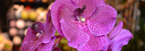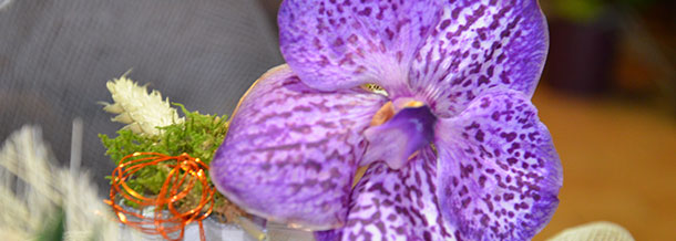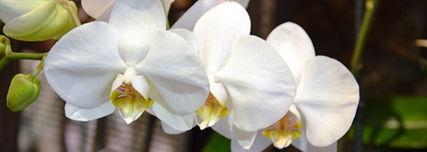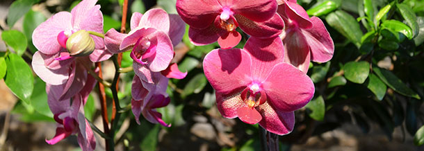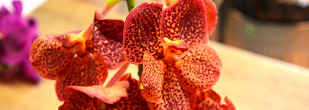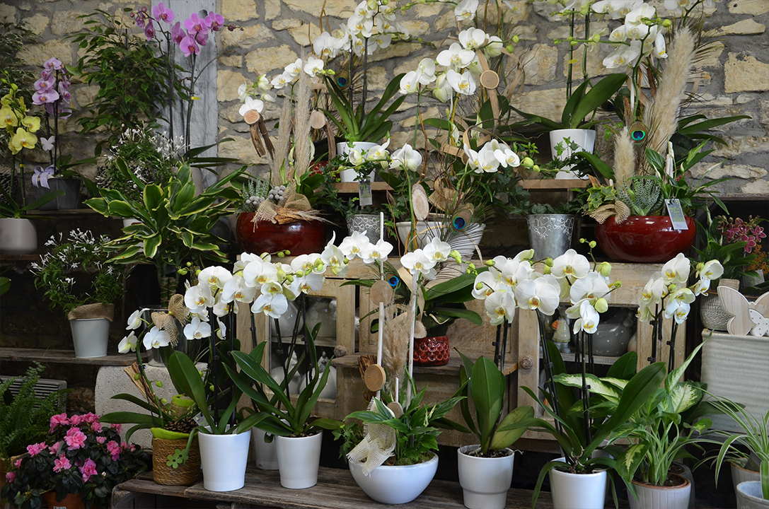 Orchidées (cambria, sabot de vénus en hiver ; et phalaenopsis en été), plantes exotiques (broméliacées), anthurium, lys, mini-rosiers…